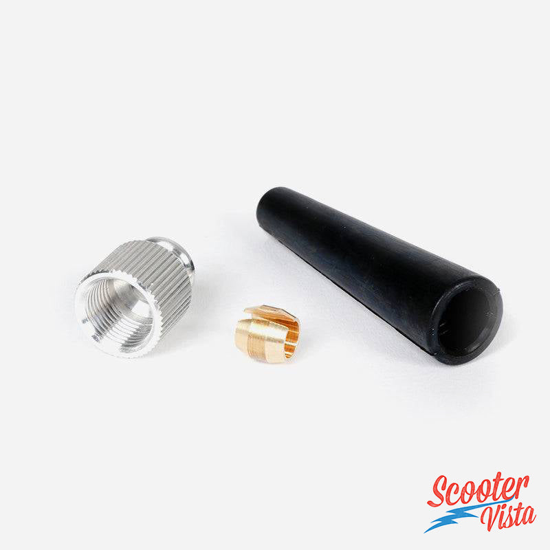 This Lambretta Black Speedo Cable Lower Clamp Set sits at the bottom of the Speedo Cable, it simply connects into the Front Hub connecting the Speedo Cable to the Front Hub. Along with the Speedo Cable Sleeve, you also get the Brass Speedo Cable Olive Bush.